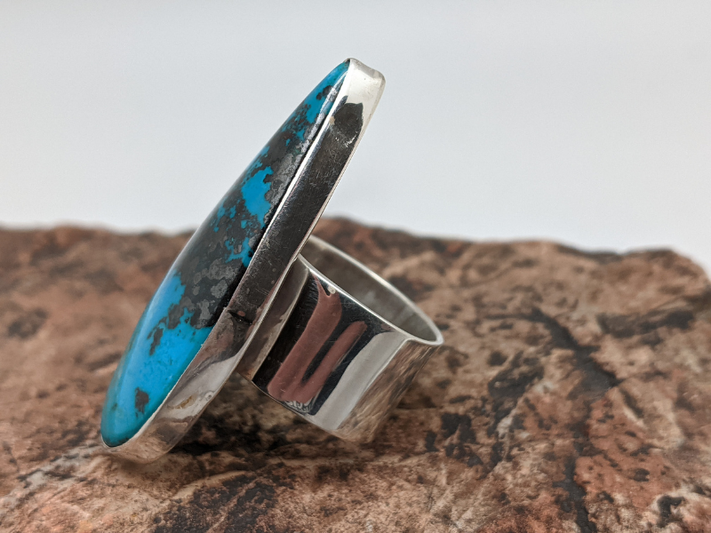 Tear drop shaped Chrysocolla that comes from the Congo is mounted on a wide sterling silver cigar band. The color is superb! The width of the band is approximately 1/2" wide. The length is 1 3/4" and 5/8" at the widest part. Size 7.5