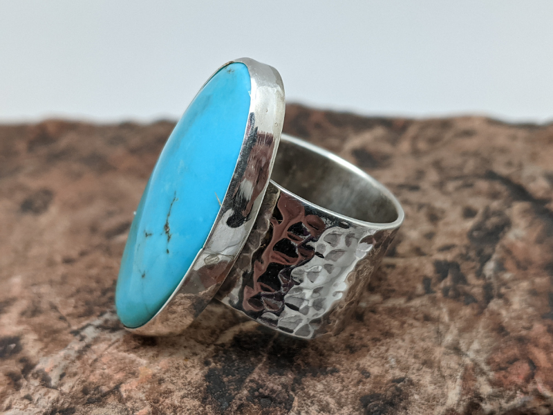 Beautiful Kingman Turquoise is mounted on a wide sterling silver cigar band that has a hammered texture. The width of the band is approximately 1/2" wide. The setting is approximately 1 1/8" in length and 5/8" wide. Size 7