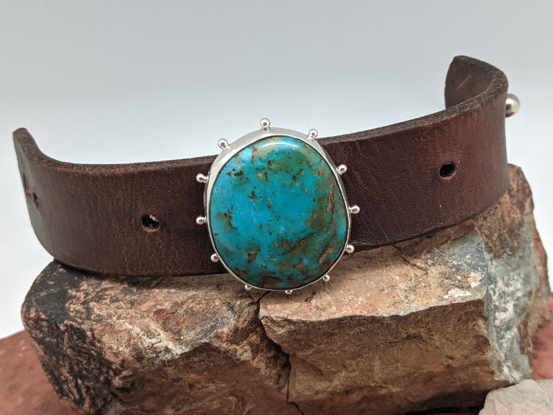 Kingman Turquoise with red matrix stone is 67.5 ct and has been set in sterling silver. The setting measures approximately 1 7/8" in length by 1 1/2" wide. It is mounted on leather that comes from retired horse tack that has been thoroughly cleaned and reconditioned. The width of the leather is 1 1/4". Button stud closure. The bracelet is 7.5" and will fit a wrist that is 6.5" to 6.75".