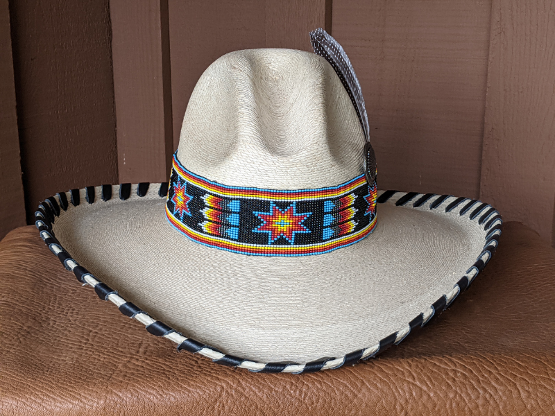The Santa Fe Chief hat starts with a soft Gus palm hat body that has a 4" brim and 5" crown. Hand laced in 10mm wide black leather lace. The 2" wide beaded hatband has lots of colors in black, blue, red, yellow, orange and white. The back of the band has a deer antler bead for accent. Accented with an Indian Chief Concho and a guinea fowl feather.