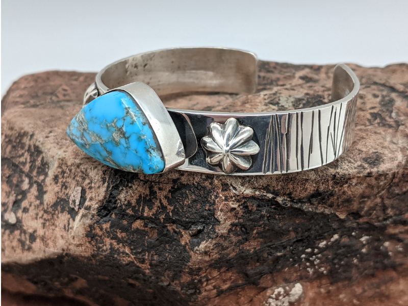 Beautiful Kingman High Blue Turquoise Sterling Silver cuff. This stone measures approximately 1 1/4" in length by 5/8" wide. It is a total of 21ct. Sterling silver berries add to the features of this beauty. The width of the cuff is a 1/2" wide with an opening of 1" The cuff is heavy duty and therefore will not open up very much. It will fit a wrist that is 6.5".