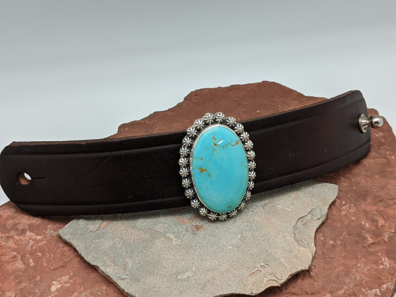 A few more details about this bracelet: The setting measures approximately 2 1/4" in length by 1 5/8" wide. It is mounted on leather that comes from retired horse tack that has been thoroughly cleaned and reconditioned. The width of the leather is 1 3/8". Button stud closure. The bracelet is 8" and will fit a wrist that is 7".
