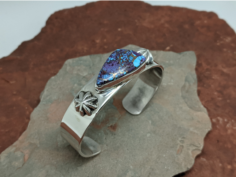 Purple Mohave Turquoise Sterling Silver cuff. This stone is a composite of Purple Mohave, Bronze and Kingman Turquoise. The crushed products are compressed into a brick and then the lapidarist cuts the brick into cabochons.