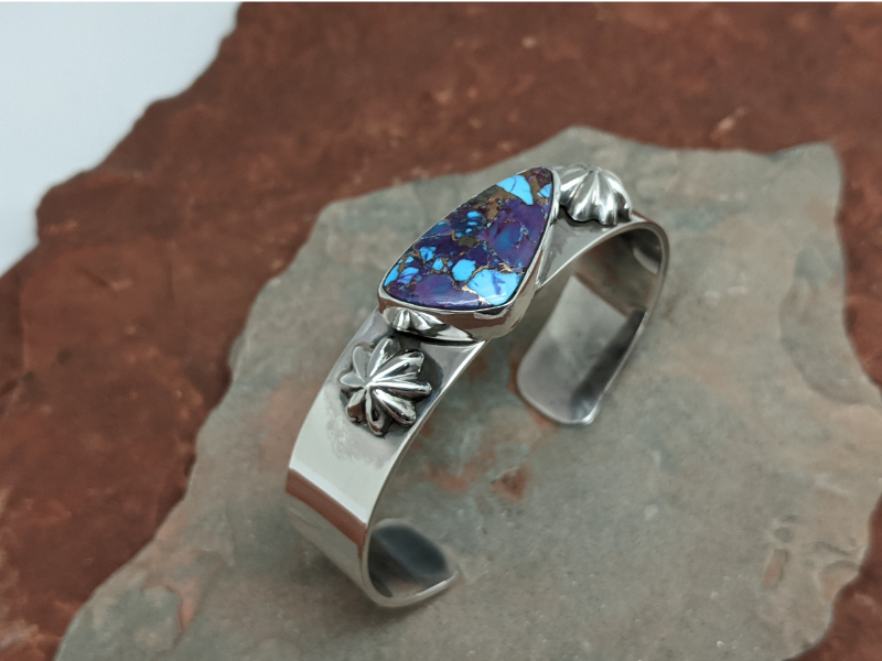 Purple Mohave Turquoise Sterling Silver cuff. This stone is a composite of Purple Mohave, Bronze and Kingman Turquoise. The crushed products are compressed into a brick and then the lapidarist cuts the brick into cabochons.