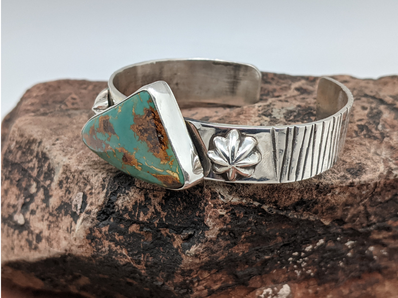 This is one nice chunk of Royston Turquoise! The setting measures approximately 1 3/8" in length by 7/8" wide and is 30 ct. Sterling silver berries and etching adds to the features of this beauty. The width of the sterling silver cuff is a 1/2" wide with an opening of 1" The cuff is heavy duty and therefore will not open up very much. It will fit a wrist that is 6.5" or less.